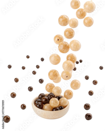 Playful flying mix of tapioca pearl and candy falling into wooden bowl. sweet tasty ingredient for delicious bubble tea or dessert