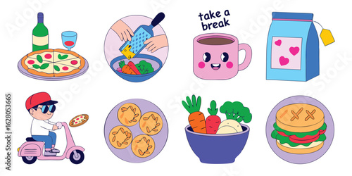 Playful Food Icons Pizza, Wine, Healthy Veggies, Dessert, Tea and Cute Character on Scooter Illustration