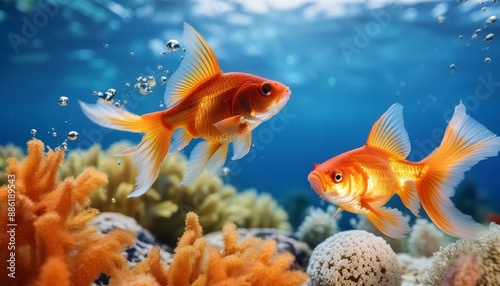 Playful Goldfish in a Sea of Color: Leaping Among Coral and Sponges" "Joyful Dance of Goldfish: Vibrant Coral Reef Serenity"
