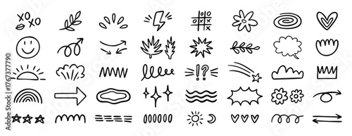 Playful kids doodle elements set with icons and cute shapes. Monochrome line art, hand drawn.
