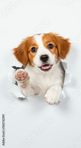 Playful Kooikerhondje Puppy Breaking Through Torn Paper - Dutch Spaniel Breed Delight