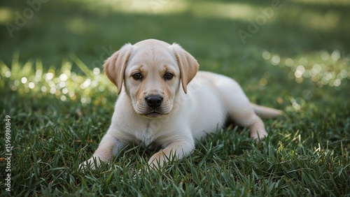 Playful labrador puppy on green lawn
