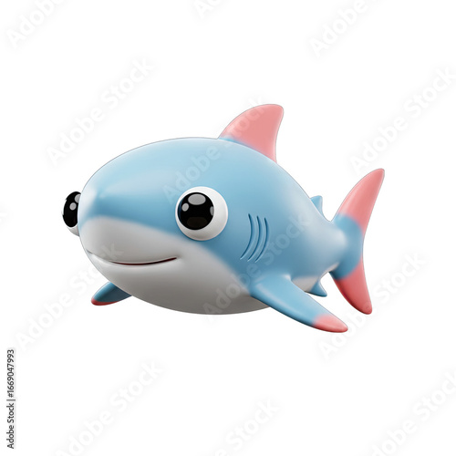 Playful, light blue cartoon shark with big eyes floats against a stark black background.
