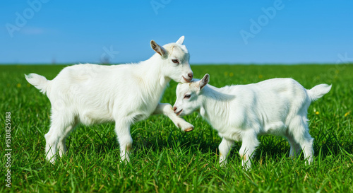 Playful Little Goats on Green Grass Under Blue Sky – Nature Scene