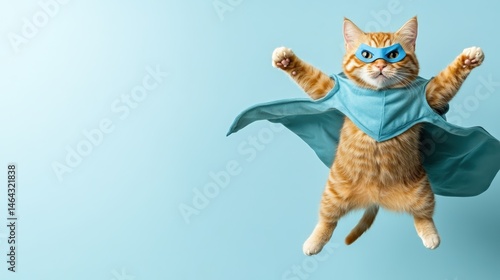 Playful orange tabby cat dressed as a superhero with blue mask and cape jumping in front of a light blue background for fun and creative concept