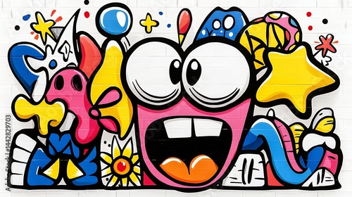Playful Pixel Art Mural with Cartoon Character and Colorful Doodles