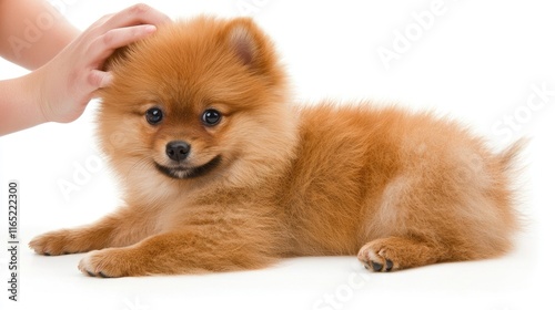 Playful pomeranian puppy being petted at home adorable pet photography cozy indoor setting