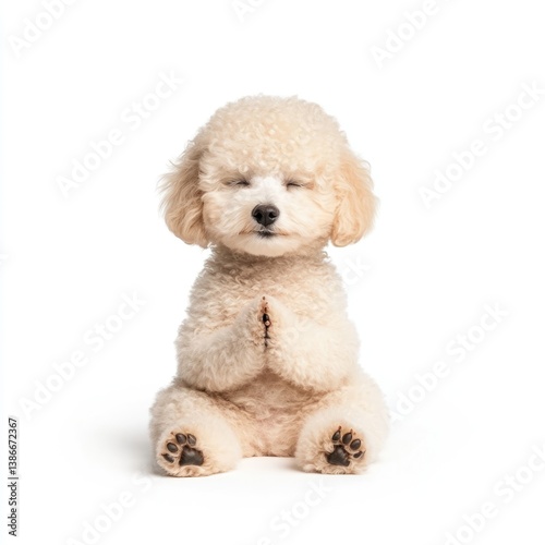 Playful poodle puppy meditating indoor studio pet photography calm environment close-up perspective serenity concept