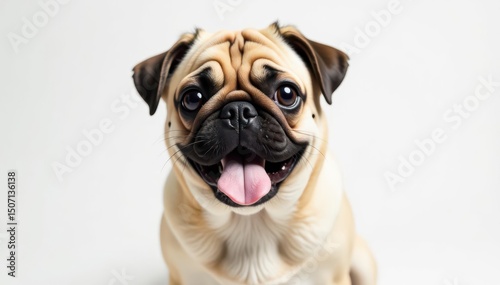 Playful pug looking directly at camera, white backdrop, single, wrinkles, portrait