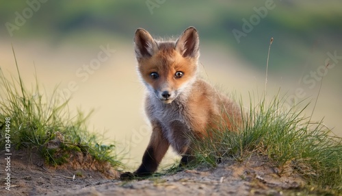 Playful Red Fox Cub Frolicking in a Winter Wonderland, Cloaked in Soft Fur and Bold Whiskers, Framed against the Backdrop of a Majestic Coniferous Forest.