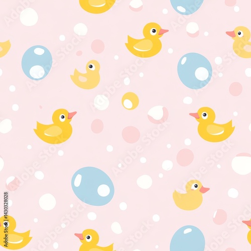 Playful repeating pattern design, floating soap bubbles, cute bath time ducks, soft pastel color palette, transparent water droplets, continuous geometric layout, clean vector illustration style,