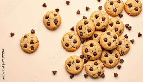 Playful scatter of chocolate chip cookies on a beige surface, texture, playful