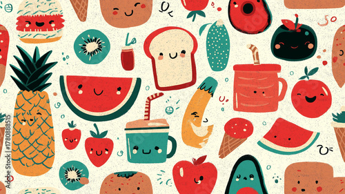 Playful seamless pattern featuring cute food illustrations like watermelon, pineapple, bread, and coffee cups with smiling faces, creating cheerful and whimsical design