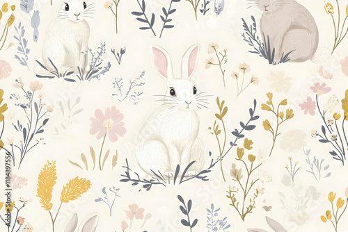 Playful seamless pattern featuring rabbits and floral elements in soft pastel shades for spring-themed creations