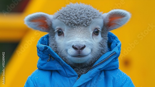 Playful Sheep in Blue Coat with a Cheerful Expression Outdoors