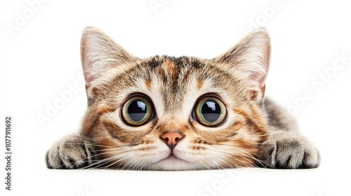 Playful tabby kitten with big eyes, lying down on a white background