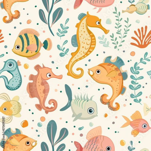Playful Underwater Delights - Whimsical Fish and Seahorses Seamless Pattern in Cute Illustration