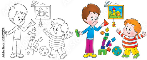 Playing boys (black-and-white and color illustrations)