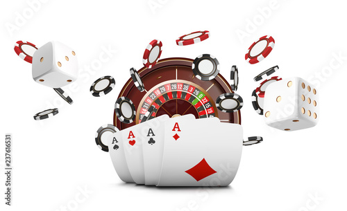 Playing cards and poker chips fly casino. Casino roulette concept on white background. Poker casino illustration. Red and black realistic chip in the air. Gambling poker mobile app icon.
