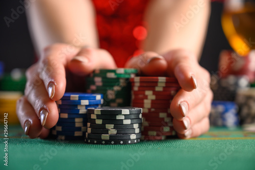Playing cards in a casino, raising bets with chips. Success and victory. Poker, blackjack, Texas poker. Las Vegas