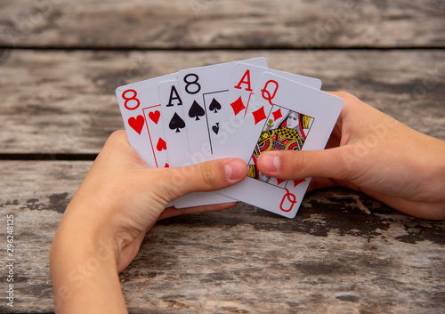 Playing cards in human hands on a wooden background.