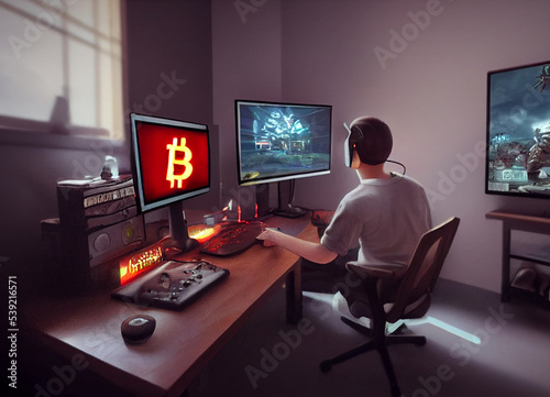 Playing computer games, gamer looking at monitor and play to earn money, crypto gaming concept, action on the screen