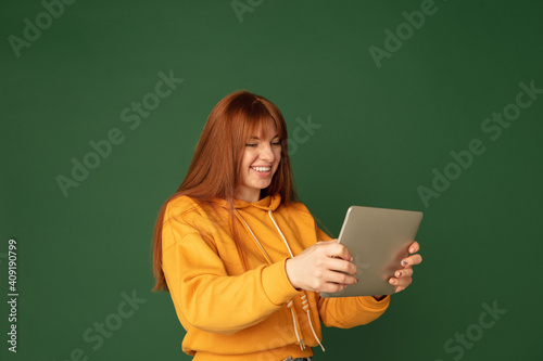 Playing excited. Caucasian woman's portrait isolated on green studio background with copyspace. Beautiful female model with tablet. Concept of human emotions, facial expression, sales, ad, fashion.