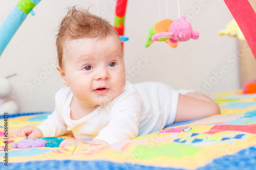 Playing little child on the colored mat for developing