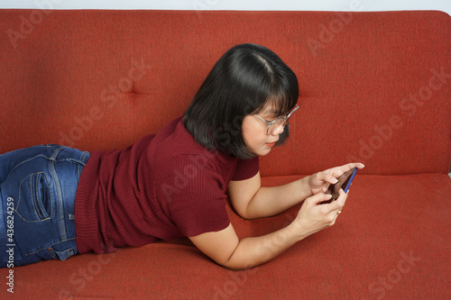 Playing mobile games on smartphone of Young beautiful Asian women dress red shirt and jeans sitting on red couch