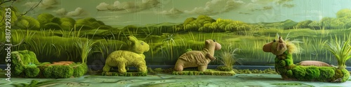 playroom with small couches shaped like animals, crafted from living moss and soft grass, against a wall painted with green landscapes