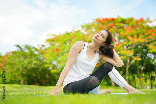 Pleasant millennial woman practice yoga outdoor in the morning during wellness retreat.
