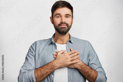 Pleased handsome male expresses his positive feeling to people who surround him, keeps hand on chest or heart, isolated over white concrete wall. Kind friendly looking unshaven man poses indoor