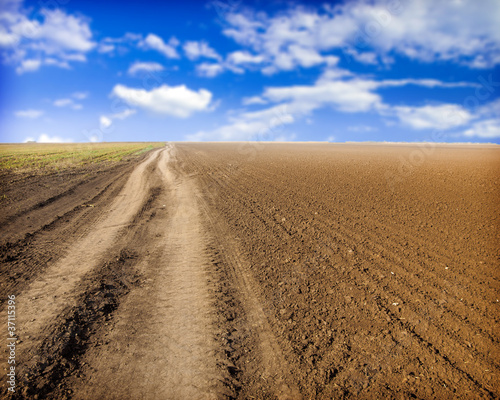 Plowed field and dirt road
