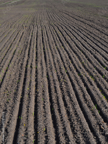 Plowed land, tilled black soil background, texture. A sown agriculture field with long furrows.