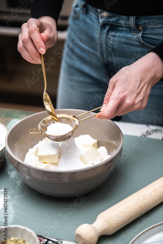 Plätzchen backen, Weihnachtsbäckerei, Weihnachtskekse selbst backen, Person backt Kekse im Advent
