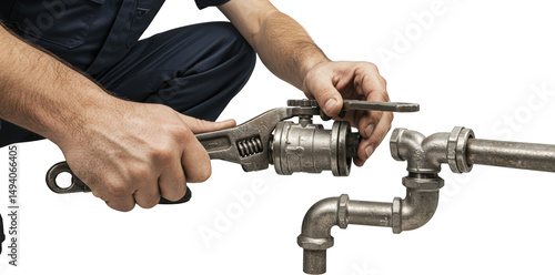 Plumber Repairing Industrial Pipe Valve with Wrench Close Up