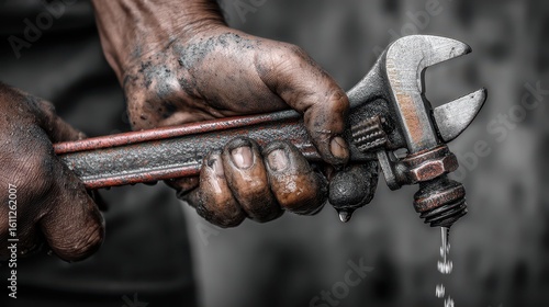 Plumber's Hands Holding Wrench Near Leaking Pipe in Focused Shot