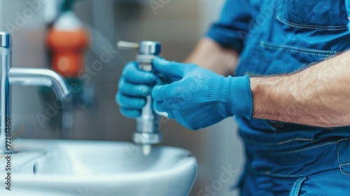 Plumbers professionally installing new bathroom fixtures sinks and toilets with a deep depth of field Home improvement renovation and residential construction concept