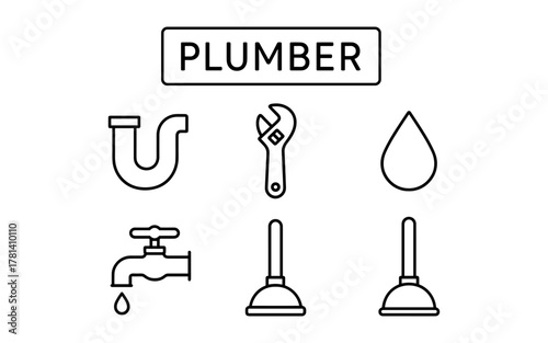 Plumbing tools set: wrench, pipe, pliers, droplet, faucet, plunger icons