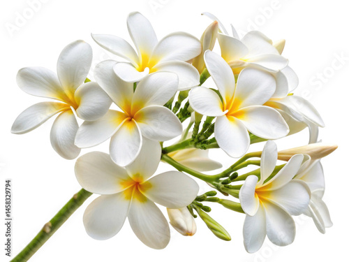 Plumeria flowers bloom beautifully with delicate petals and vibrant yellow centers, creating serene and calming atmosphere