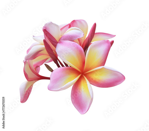 Plumeria or Frangipani or Temple tree flower. Close up single pink-yellow plumeria flowers bouquet isolated on transparent background.