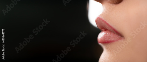 Plump lips close-up. Lip care, augmentation with fillers. Closeup with detail. Natural shape with perfect contour. Closeup perfect natural lips makeup