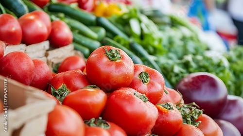 Plump red tomatoes stacked at a vibrant market stand symbolizing freshness and healthy living : Generative AI