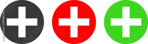 plus icon set. medical or pharmacy icon. red and green color. Plus minus and multiplying round button. add icon symbol