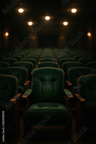Plush emerald green velvet seat offers rich texture and comfort with ornate wooden armrest decoration inside a classic dim theater environment