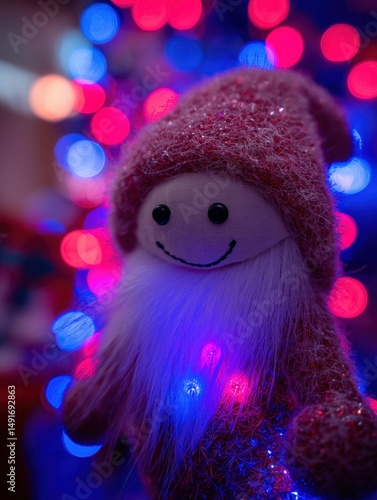 Plush stuffed animal wearing a hat, close-up on soft fabric, neutral background, daylight.