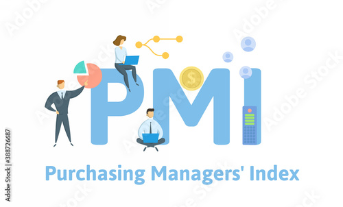 PMI, Purchasing Managers Index. Concept with keywords, people and icons. Flat vector illustration. Isolated on white background.