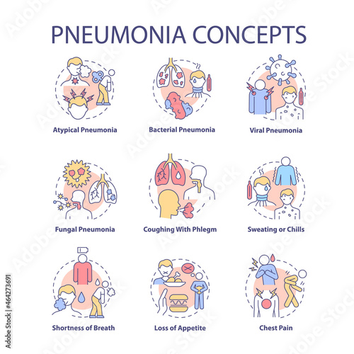 Pneumonia concept icons set. Pulmonary inflammation idea thin line color illustrations. Bacterial and viral types. Coughing with phlegm. Vector isolated outline drawings. Editable stroke