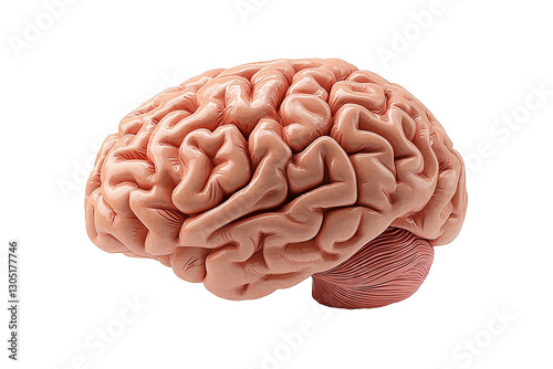 PNG cut out isolated background. A highly detailed 3D medical illustration of the human brain, showcasing its intricate folds and realistic texture.