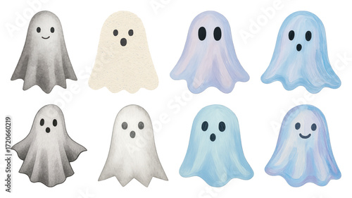 PNG Cute watercolor ghost illustrations, element set on transparent background